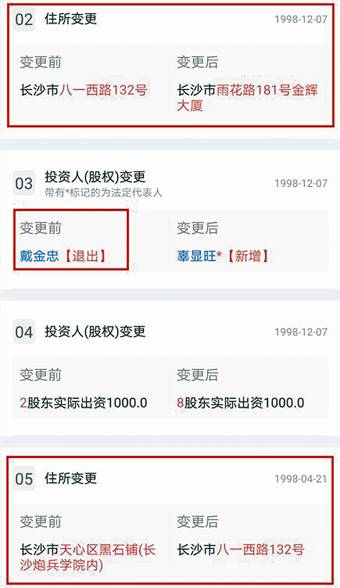 企查查顯示,一家直接名為“湖南軍信工程有限公司”的企業,成立于1997年10月23日,目前已注銷,但注銷時間未顯示,其于1998年4月21日發生過住所變更——從長沙市天心區黑石鋪(長沙炮兵學院內),變更為長沙市八一西路132號,1998年12月7日又變更至長沙市雨花路181號金輝大廈(見圖三、圖四)。這意味著,該企業成立時間和曾經的住所,與軍信環保掛牌新三板公開轉讓說明中書戴道國兼職湖南軍信工程有限公司時間比較吻合,并且曾位于長沙炮兵學院內。