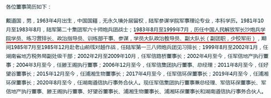 其中值得注意的是,軍信環保招股書中將戴道國于1997年1月至1999年7月期間在解放軍長沙炮兵學院四大隊任副大隊長時,兼任湖南軍信工程有限公司總經理一職的介紹刪去。刪去的還有1994年1月至1996年12月在解放軍長沙炮兵學院工程部任處長、副部長(見圖一、圖二)。