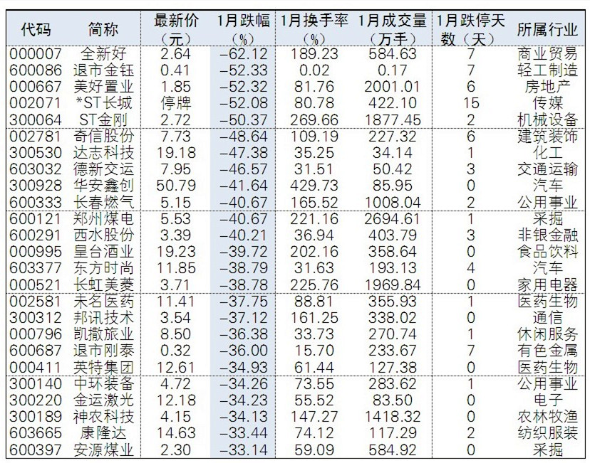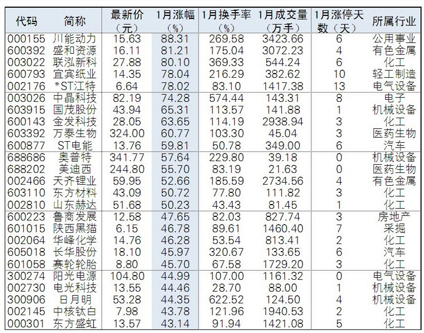 1月A股收官。根據Wind數據統計顯示,剔除1月上市新股,川能動力、盛和資源、聯泓新科1月漲幅超過了80%。從行業分布來看,1月漲幅前25只個股中,化工行業占8只。