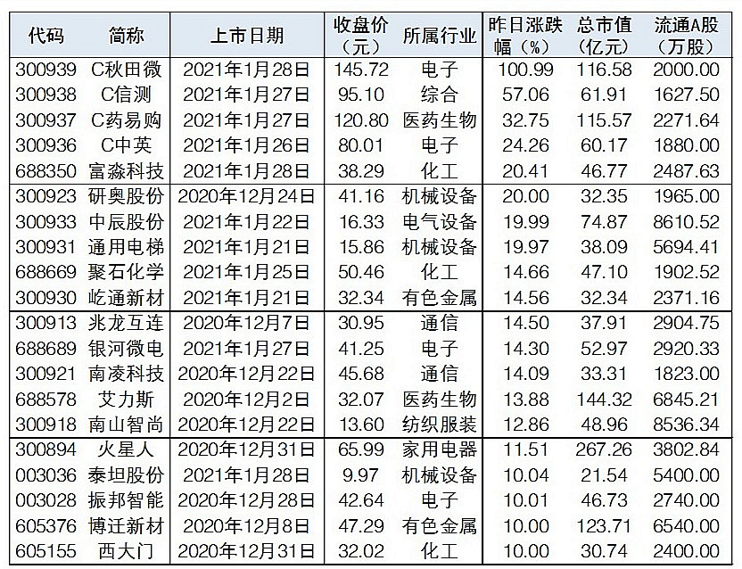 昨日次新股C秋田微、C信測、C藥易購、C中英、富淼科技、研奧股份單日漲幅超過20%。根據(jù)Wind數(shù)據(jù)統(tǒng)計(jì),去年12月以來已有89只新股,昨日漲幅超6%的有39只。
