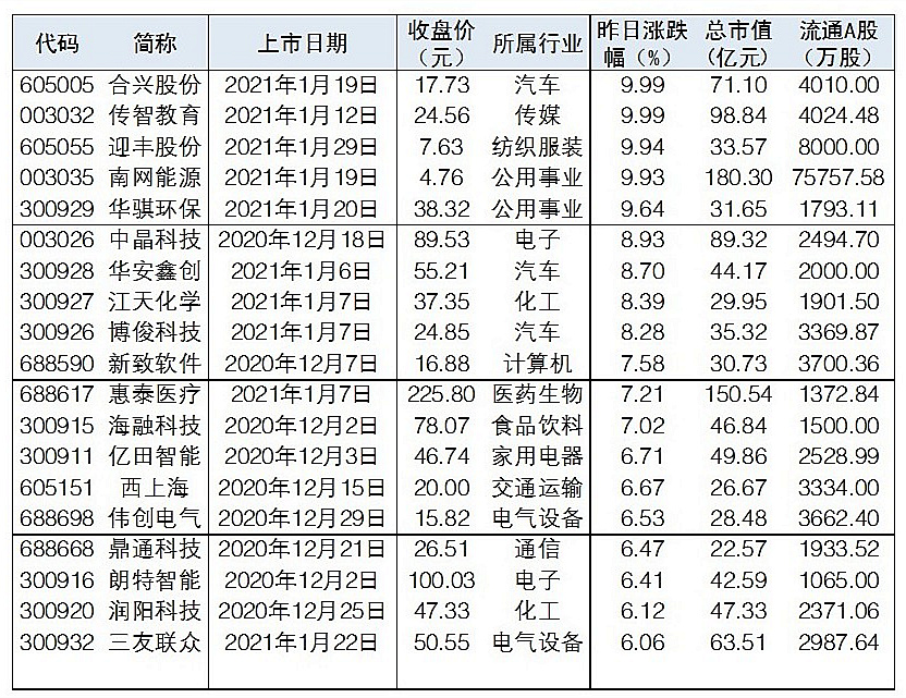 39只近端次新股昨日漲幅超6%
