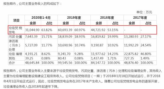 軍信環保成立于2011年,在招股書中稱自身一直聚焦于固體廢棄物處理業務,致力于整合治污資源,提高污染物處理水平,促進城市循環經濟發展和生態文明建設。軍信環保報告期內的主營業務上,包括垃圾焚燒發電、污泥處置、滲瀝液(污水)處理和垃圾填埋等業務。其中,垃圾焚燒發電可謂軍信環保核心業務,例如2019年,垃圾焚燒發電業務收入占公司全部主營收入比例高達60.97%,去年上半年進一步提升至63.82%。