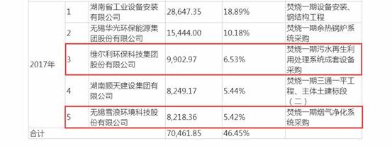 2017年,軍信環保向維爾利進行了焚燒一期污水再生利用處理系統成套設備采購,采購金額為9902.97萬元;同時向雪浪環境進行了焚燒一期煙氣凈化系統采購,采購金額為8218.36萬元。招股書顯示,報告期內的主要供應商采購金額均含稅。