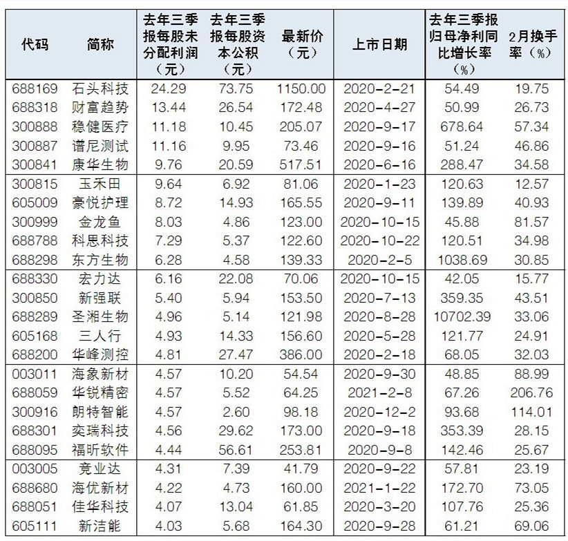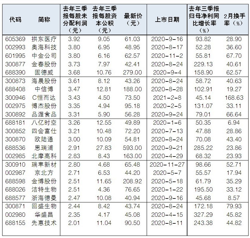 本周,愛美客計劃年報高送轉后,股價出現連續上漲。《大眾證券報》編輯根據去年三季報每股未分配利潤大于2元,每股資本公積大于2元,收盤價高于40元,去年三季報歸母凈利增速高于40%,且以去年上市次新股為標準,篩選出47股存在高送轉預期。