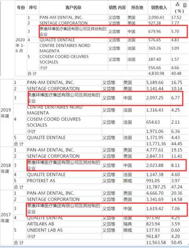家鴻口腔招股書顯示,報(bào)告期內(nèi)每年前五大客戶中有且僅有一家國內(nèi)公司——泰康拜博及其控制的企業(yè),2017-2020年1-6月,家鴻口腔分別對其實(shí)現(xiàn)銷售收入1619.42萬元、2023.88萬元、2097.25萬元、679.96萬元,對應(yīng)占當(dāng)期銷售比例分別為7.06%、8.11%、6.77%、5.70%,在報(bào)告期內(nèi),泰康拜博及其控制的企業(yè)一直是家鴻口腔的第三大客戶及國內(nèi)最大客戶(見下圖)。