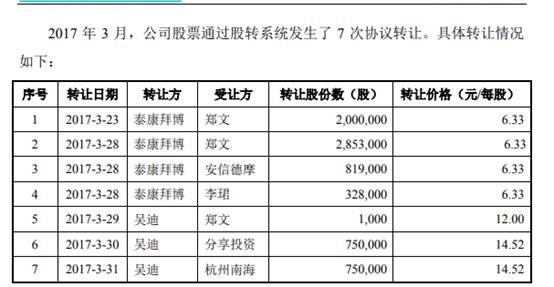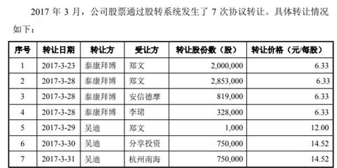 招股書顯示,2017年3月,家鴻口腔的股票通過股轉(zhuǎn)系統(tǒng)發(fā)生了7次股權(quán)轉(zhuǎn)讓協(xié)議(見下圖),根據(jù)招股書,7次股權(quán)轉(zhuǎn)讓發(fā)生在2017年3月23日—31日,前后時(shí)間跨度一周左右。其中泰康拜博共發(fā)生四次股權(quán)轉(zhuǎn)讓,受讓方分別是家鴻口腔的實(shí)控人鄭文、機(jī)構(gòu)安信德摩以及李珺,分別受讓了485.3萬股、81.9萬股、32.8萬股,這幾次股權(quán)轉(zhuǎn)讓價(jià)格保持一致,均為6.33元/股。