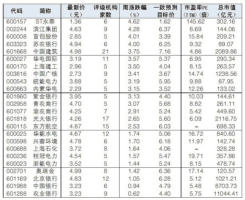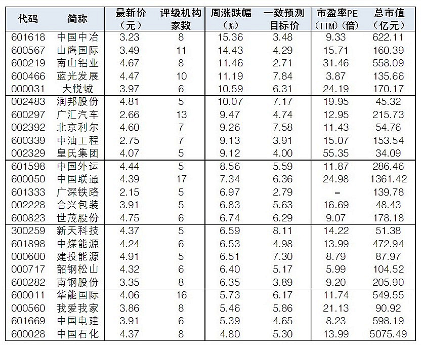 本周低價股有所表現。《大眾證券報》編輯根據昨日收盤價低于5元,評級機構家數超過4家為標準,篩選出48只優質低價股,其中中國中冶、山鷹國際、南山鋁業、藍光發展、大悅城、潤邦股份本周漲幅超過10%。