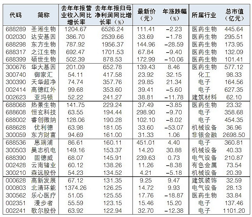 年報加速披露中。根據Wind數據統計,截至昨日,49股去年年報營業收入、歸母凈利同比增速均超過50%。這其中,北清環能昨日漲停,昊志機電、潔特生物分別上漲15.17%和11.50%。