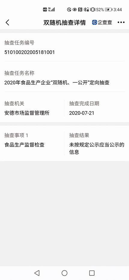 此外,企查查還顯示,2020年7月21日,在安德市場監(jiān)督管理所開展的2020年食品生產(chǎn)企業(yè)“雙隨機、一公開”的定向抽查中,丁點兒股份在食品生產(chǎn)監(jiān)督檢查中,被披露未按規(guī)定公示應(yīng)當(dāng)公示的信息(見圖四)。