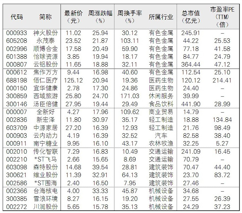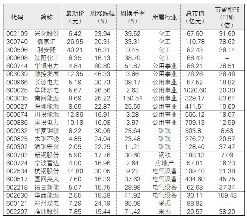本周市場在連續調整后出現反彈。根據Wind數據統計顯示,本周周漲幅超過15%的共計有46股;從行業來看,集中在有色金屬和公用事業這兩大行業。