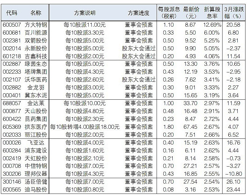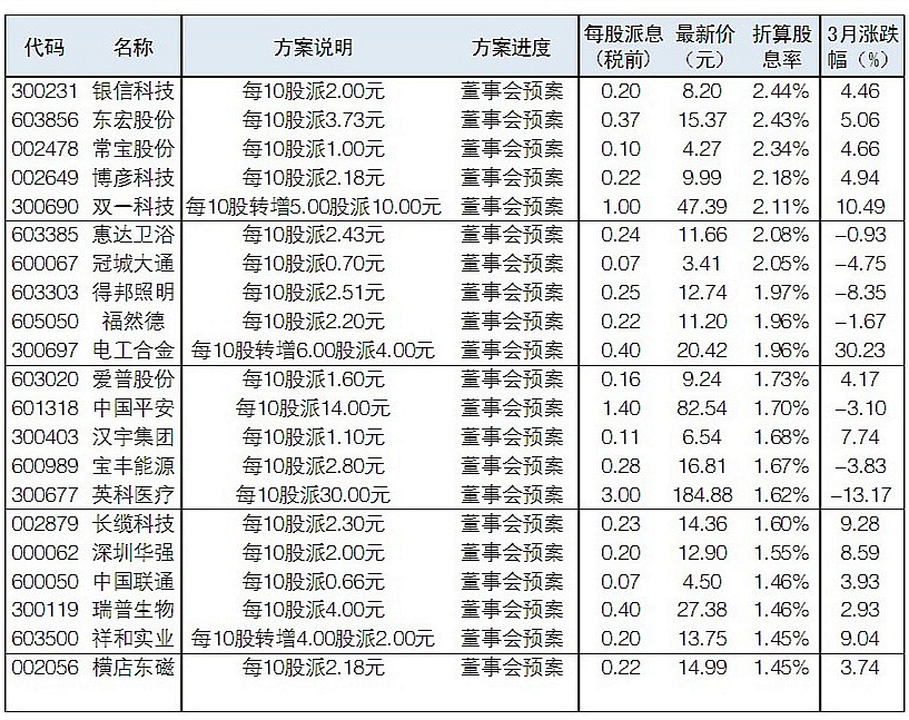 根據Wind統計,截至昨日,149家公司發布年報分紅預案。除了山東郝達和首華燃氣選擇轉增外,其他147家公司均選擇了現金分紅或現金分紅加送股或轉增的形式。以昨日收盤價計算,43家公司股息率超1.45%。