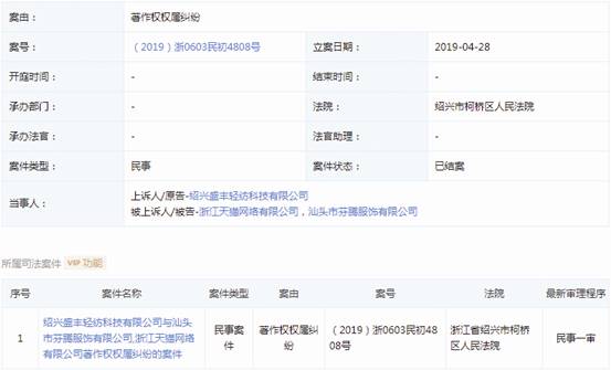 數(shù)據(jù)顯示,原告紹興盛豐輕紡科技有限公司(下稱“紹興盛豐”)訴被告汕頭市芬騰服飾有限公司(下稱“芬騰服飾”)、浙江天貓網(wǎng)絡(luò)有限公司著作權(quán)權(quán)屬、侵權(quán)糾紛一案(圖一),于2019年4月28日立案,案號為(2019)浙0603民初4808號。不過,不到一個月的時間,原告紹興盛豐又于2019年5月20日提出撤訴申請。對于上述糾紛案,洪興實(shí)業(yè)并未在招股書中披露。