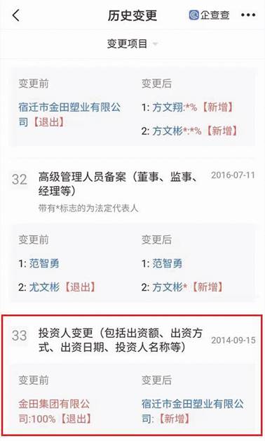 企查查還顯示,宿遷金田2007年1月17日成立,最初由方文彬、方文翔以及金田集團共同出資,但工商登記信息中無具體持股比例信息。2014年7月24日金田集團退出,2014年12月23日金田集團又成為股東之一。到2016年8月1日,金田新材才受讓了上述三位股東全部股權,將宿遷金田變為全資子公司(見圖七、圖八)。