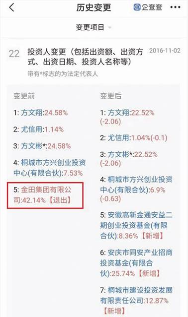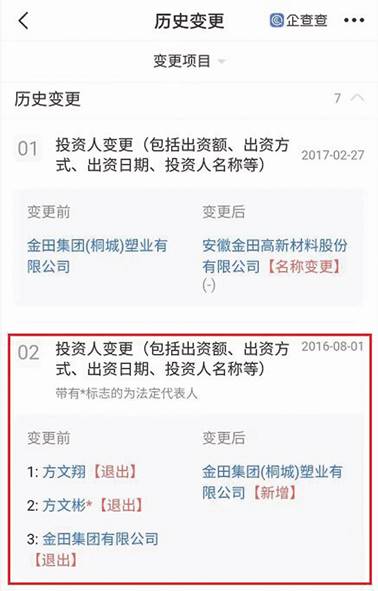 2016年7月18日,金田新材增資的同時,又發生了投資人變更,方文彬、方文翔之外,新增了3位股東,其中就有已退出的金田集團,其持股比例42.14%,系第一大股東(見圖三)。