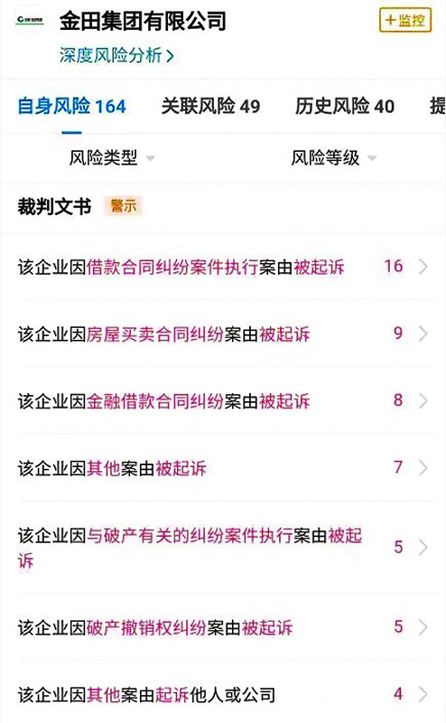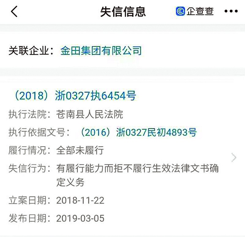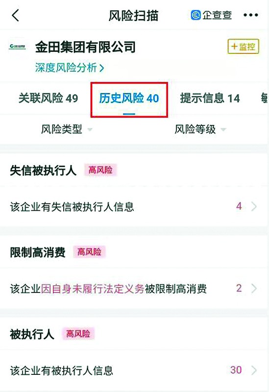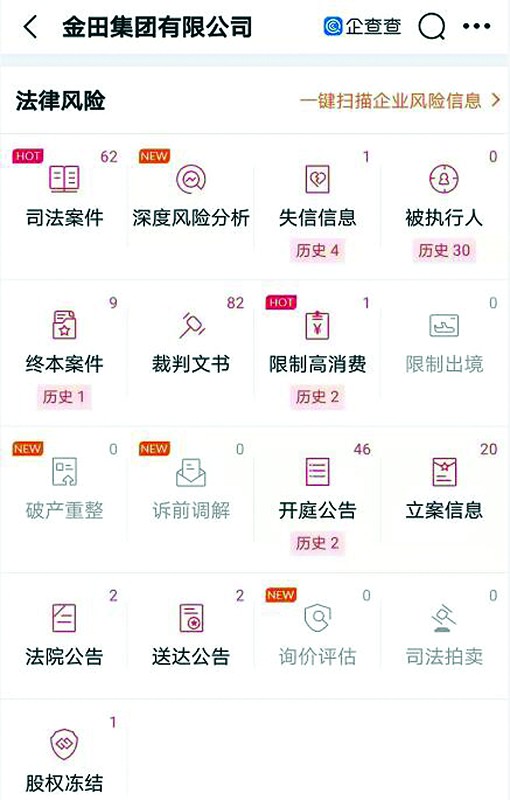 值得注意的是,記者查詢發現,金田集團法律糾紛信息眾多,尤其是目前仍存在失信信息和限制高消費信息,歷史上也有多條失信和限制高消費等相關信息。