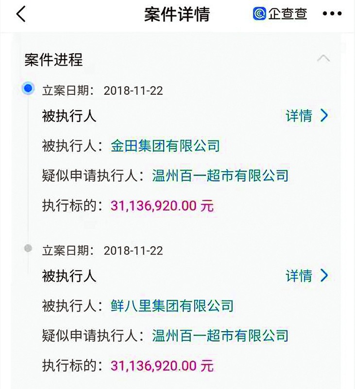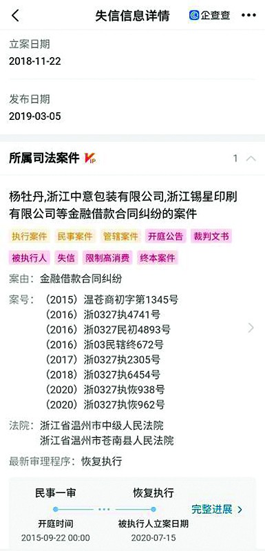 金田集團目前有一條自身作為失信被執行人的失信被執行信息,系溫州市蒼南縣人民法院于2018年11月22日立案,2019年3月5日發布,案號(2018)浙0327執6454號,失信行為為有履行能力而拒不履行生效法律文書確定義務(見圖二)。所屬司法案件為金融借款糾紛,民事一審開庭時間為2015年9月22日,根據案情,被執行標的3113.692萬元(見圖三、圖四)。