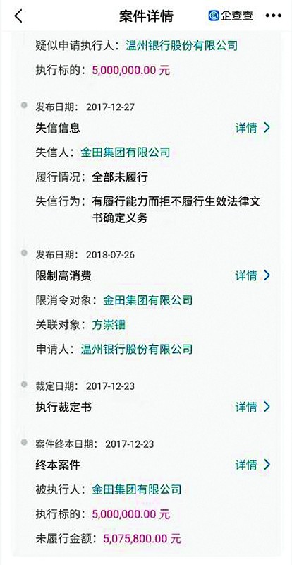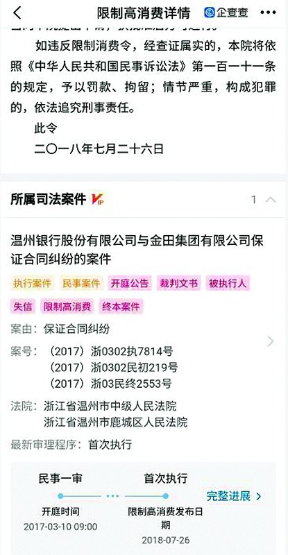 金田集團自身還有一條限制高消費信息。溫州鹿城區人民法院發布的限制消費令顯示,申請人為溫州銀行股份有限公司,限消對象為金田集團有限公司,關聯對象方崇鈿。該案立案日期為2017年9月19日,發布日期為2018年7月26日,案號(2017)浙0302執7814號(見圖五)。所屬司法案件為保證合同糾紛,民事一審開庭時間為2017年3月10日。根據案情,相關案件未履行金額507.58萬元(見圖六、圖七)。