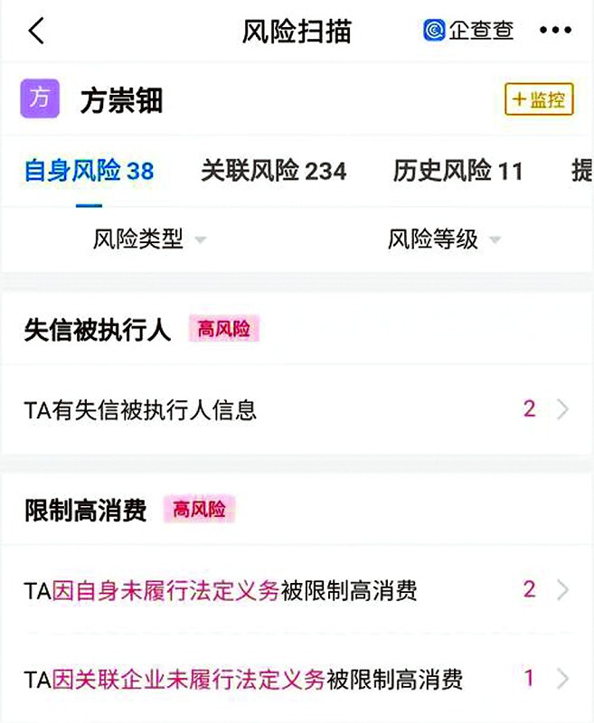 企查查顯示,金田新材兩位實控人方文彬、方文翔控制的金田集團法律糾紛信息眾多,甚至目前仍存在失信被執行人信息、限制高消費等高風險事項(見圖一)。