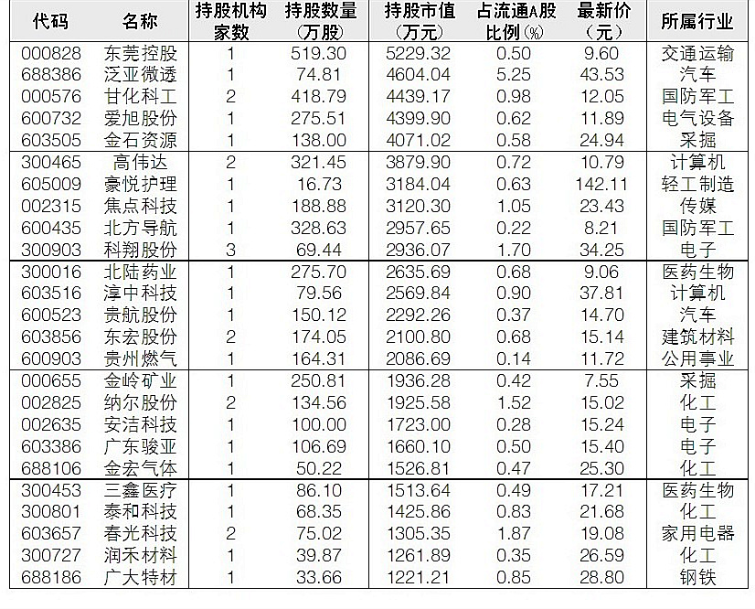 從持股數量看,榮安地產、方大特鋼、海螺水泥、中環股份、京運通被持數量居前;持股市值方面,海螺水泥、金龍魚、中環股份等居前。