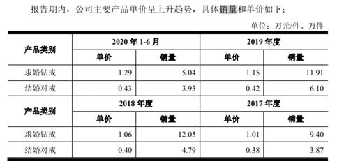 不過,迪阿股份在銷售費用上的“大手筆”砸錢,并未在產品銷量上體現明顯成效。以公司的主打產品定制求婚鉆戒來看,2017-2020年1-6月的銷售收入分別為9.50億元、12.75億元、13.69億元、6.49億元,銷售收入持續增長的背后,還有產品單價提升。迪阿股份的求婚鉆戒單價由2017年的1.01萬元上漲到了2020年1-6月的1.29萬元。而銷售數量上,數據顯示,2017-2020年1-6月,迪阿股份的求婚鉆戒銷量分別為9.40萬件、12.05萬件、11.91萬件、5.04萬件,其中2019年求婚鉆戒銷量較2018年減少了0.14萬件,下滑1.16%(見圖一)。