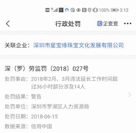 招股書顯示,深圳市星寶緣珠寶文化發展有限公司(以下簡稱“星寶緣”)為迪阿股份報告期內整體第二大委外供應商,2017-2020年上半年,公司分別向其采購484.05萬元、1938.20萬元、2489.78萬元、2974.10萬元,對應的采購占比分別為2.71%、8.35%、10.22%、20.19%。然而企查查顯示,星寶緣曾在2018年2月、3月因違法延長工作時間超過36小時部分涉及14人,于2018年6月15日被深圳市羅湖區人力資源局行政處罰(見圖二)。