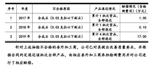實際上,在報告期內,迪阿股份在自身通過抽檢進行“品控”的過程中,也曾發現委外加工廠商產品存在質量問題,比如2018年、2019年曾分別各檢出2批次貨品貴金屬含量低于合同約定的標準。甚至2017—2019年,公司在抽檢中還曾發現累計6批次貨品出現了合成石充當天然鉆石的情況(0.03克拉以下鉆石)(見圖三)。