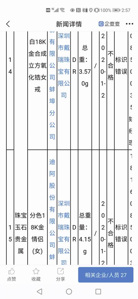 上述多批次被抽檢出不合格的產品究竟出自哪家委外加工商,迪阿股份并沒有進行明確披露,其表示:“針對上述檢測不合格的委外加工商,公司已對其提出改善質量要求,并根據合同約定退還該批次全部產品,由相應委外加工商承擔檢測費用并對公司進行了相應賠償?!?這樣的解釋是否也意味著——在抽檢進行“品控”的過程中,雖然發現了不合格的產品,迪阿股份也只是以退貨和要求賠償為主,對委外加工商雖然進行了“教育”,但是并未將生產不合格產品的委外加工商“拉黑”,公司仍然存在委托其代為生產加工的情況? 需要指出的是,企查查顯示,在2020年第一季度蚌埠市市場監管局第一季度市級監督檢查中,迪阿股份蚌埠分公司受檢的兩款產品,白18k金合成立方氧化鋯女戒、分色18K金情侶(女)戒,因標識錯誤,被認定為不合格(見圖四)。對此,迪阿股份在招股書中并未進行披露。