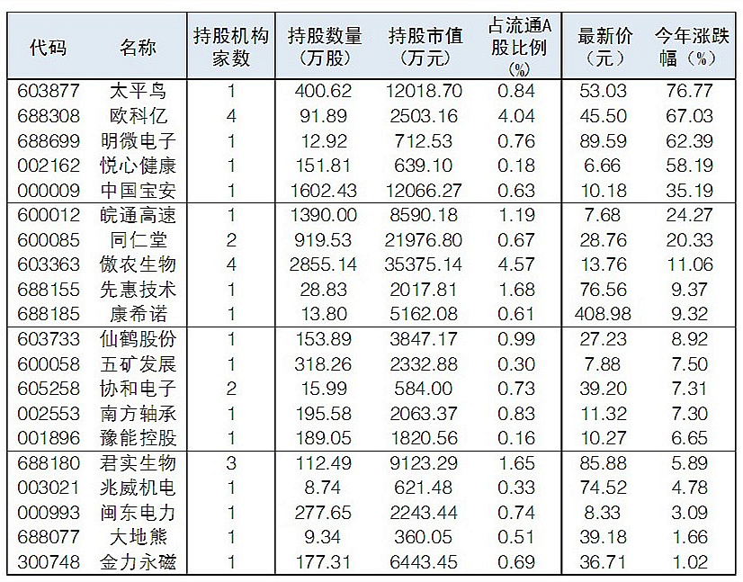 年報披露加速中。根據Wind統計,截至昨日,去年券商新增持有40家公司。從持股市值來看,傲農生物、金龍魚、同仁堂、贏合科技、帝歐家居、中國寶安、太平鳥居前。從二級市場看,太平鳥、歐科億、明微電子、悅心健康今年年漲幅已超50%。