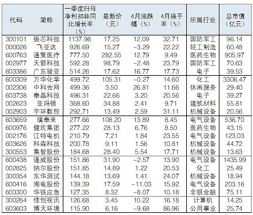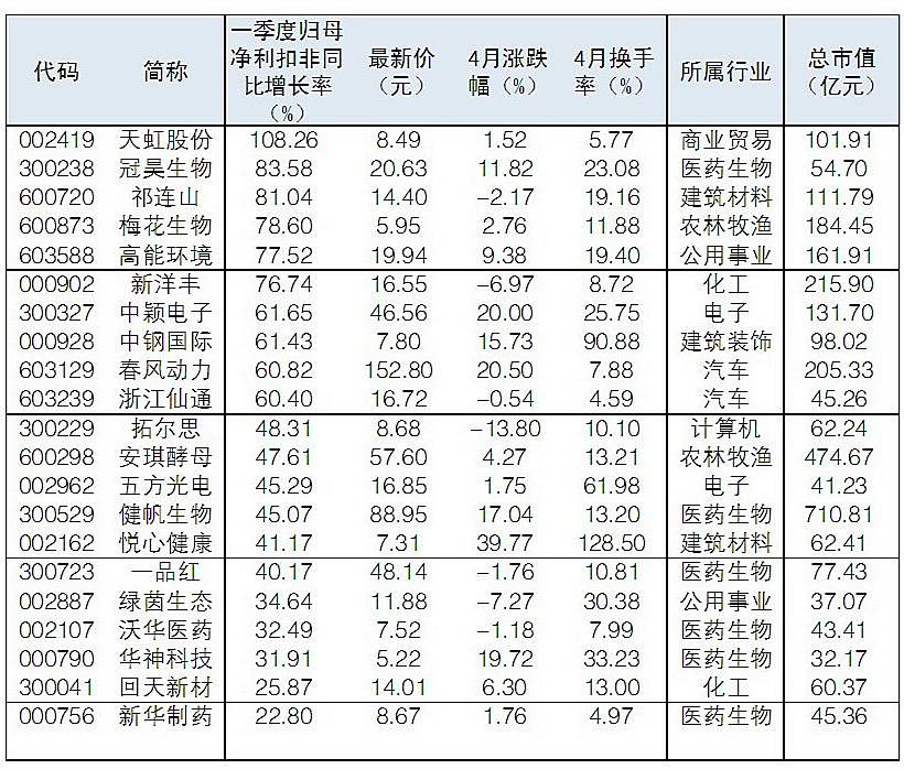 根據Wind統計,截至昨日,已有59家公司披露一季報業績,其中43股一季報歸母凈利扣非同比增速超20%。從二級市場來看,悅心健康、中科云網、春風動力、中穎電子4月漲幅超過20%。