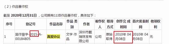 值得一提的是,迪阿股份在招股說明書中披露:公司擁有一項文字作品“真愛協議”的著作權,該項文字作品的著作權人為深圳市戴瑞珠寶有限公司,“真愛協議”創作及首次發表時間為2010年4月8日,該作品登記號為國作登字-2015-A-00184805,顯示登記日期為2015年(見圖一)。