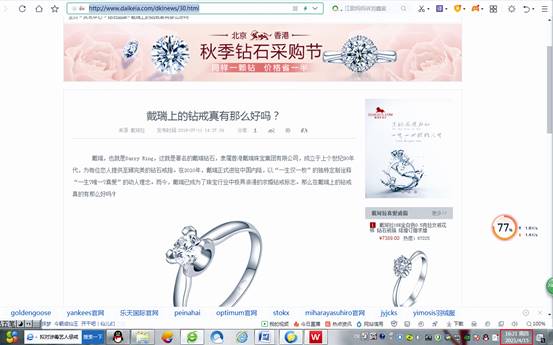 從曹菁提供的2015年8月12日,2017年4月17日和6月1日的戴瑞有限官網截圖看,其官網曾如此介紹公司品牌的歷史:“戴瑞珠寶隸屬于香港戴瑞珠寶集團,于上世紀90年代開始裸鉆高級定制”、“早于上個世紀90年代,戴瑞珠寶便在香港從事裸鉆高級定制,搜集來自世界各地的珍稀鉆石。這些卓越品質的鉆石,戴瑞珠寶只提供給少數專屬的頂尖珠寶商(見圖三)。”
