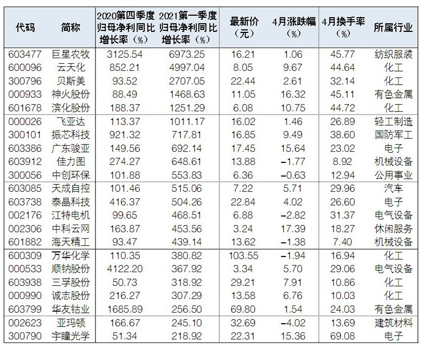 隨著年報、季報加速披露,上市公司單季盈利情況浮出水面。根據Wind數據統計顯示,截至昨日,44股去年第四季度、今年第一季度歸母凈利同比增速均超50%。