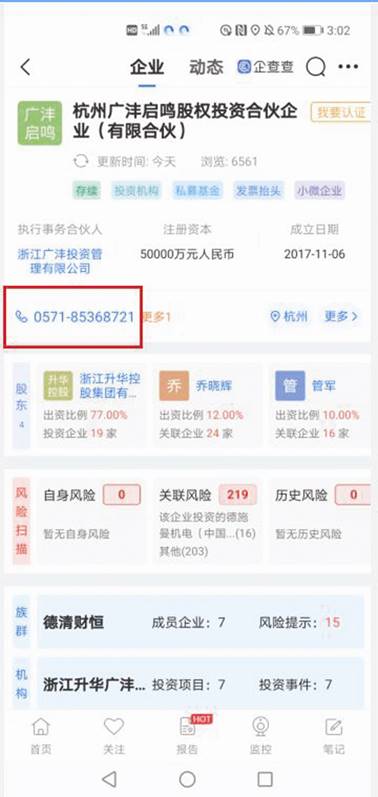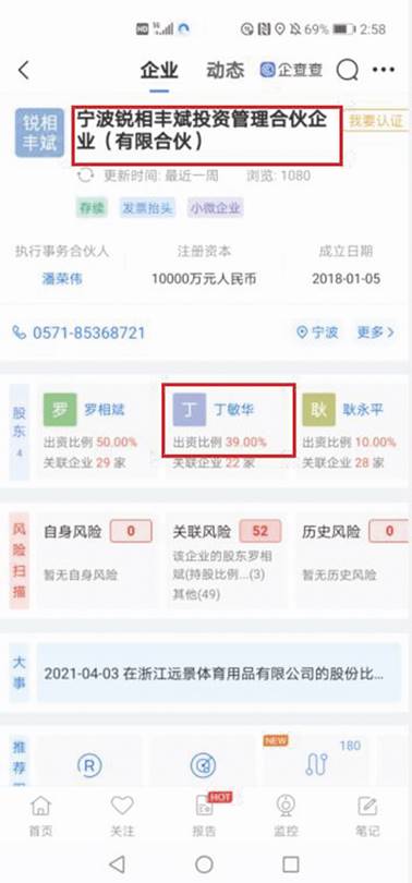 企查查顯示,丁敏華同時還持有寧波銳相豐斌投資管理合伙企業(有限合伙)39%的股份,而該企業與優全護理2018年增資入股的另一股東廣灃啟鳴使用的電話號碼完全相同,兩者皆為0571-85368721(見圖二)。