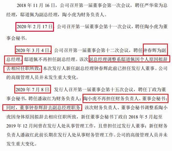這樣解釋的背后,仍有諸多的疑惑:“2020年3月至7月,短短4個多月的時間,邸道佩、鐘春輝先后兩任副總經理接連辭職,原因是什么?尤其是鐘春輝剛被聘任為副總經理又閃電辭去該職務的原因是什么?而陶小虎的辭職,則意味著公司關鍵管理崗位——財務負責人和董秘同時換人,雖然招股書稱陶小虎辭職是因為身體原因,但是為何在陶小虎辭職4個多月前,公司還要聘任原本擔任財務負責人的陶小虎為公司董事會秘書?公司董、監、高的頻繁換人,公司在高管的選聘過程中,是否經過了充分地考察、是否遵循了審慎原則?公司有何制度來保證管理層的穩定?”