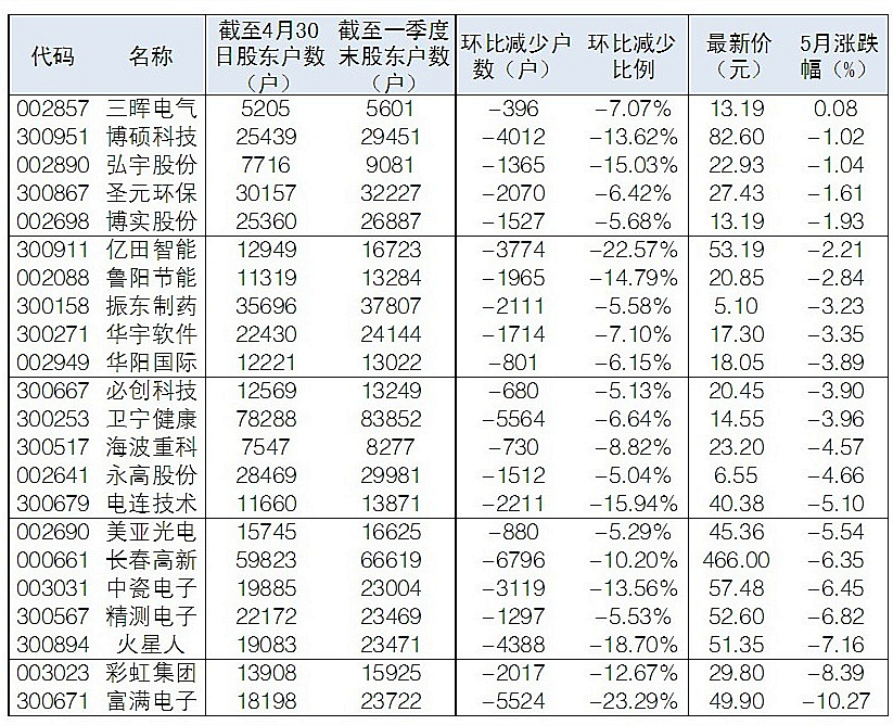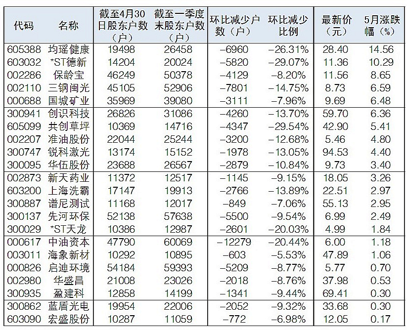 根據Wind數據統計,截至昨日,已有183家公司披露了4月末的股東戶數,其中有44股股東戶數環比一季度末減少超5%。從二級市場來看,均瑤健康、*ST德新5月漲幅已超10%。