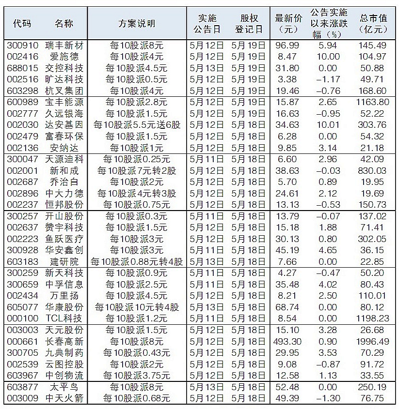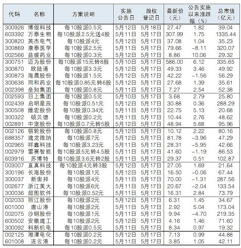 年報披露結(jié)束后,上市公司分紅陸續(xù)實施。從除權(quán)除息后個股表現(xiàn)看,部分個股走出填權(quán)行情,累計漲幅最高的前三名分別是電工合金、愛美客、拱東醫(yī)療。根據(jù)Wind統(tǒng)計,64家公司即將實施分紅計劃,其中建研院、同和藥業(yè)、中寵股份等公司計劃送轉(zhuǎn)股。