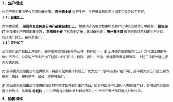 生產(chǎn)模式上,九州風(fēng)神在招股書中自述:“產(chǎn)品主要由子公司深圳鑫全盛、惠州鑫全盛進行生產(chǎn),生產(chǎn)模式包括自主加工和委外加工方式。”但招股書對公司的委外加工情況輕描淡寫,委外金額、委外產(chǎn)品類別、委外占比、定價等均未進行披露(見圖一)。