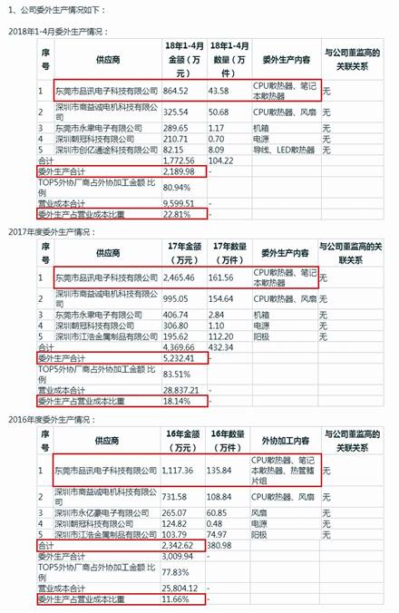 從九州風(fēng)神當(dāng)時的公開轉(zhuǎn)讓說明書披露的前五大委外生產(chǎn)廠商生產(chǎn)的產(chǎn)品來看,恰好有此次招股書中所稱全部或長期外采的機箱、電源。例如東莞市永聿電子有限公司2017年、2018年前4月均為九州風(fēng)神生產(chǎn)機箱,深圳朝冠科技有限公司更是2016-2018年前4月一直為九州風(fēng)神生產(chǎn)電源。而這兩家委外廠商也是九州風(fēng)神此次招股書中披露的報告期內(nèi)重要供應(yīng)商。
