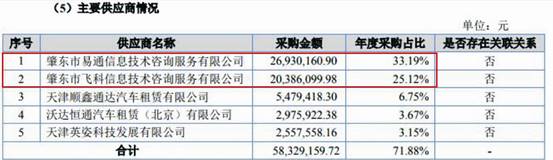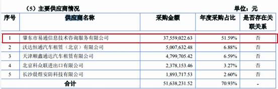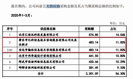 根據電旗股份招股書提供的2017-2020年1-3月的前五大供應商名單,肇東市億科信息技術咨詢服務有限公司(以下簡稱“億科信息”)及其關聯方絕對是無法讓人忽視的重要存在——2017年,電旗股份向其采購金額為6968.66萬元,占比高達58.72%,為當年度第一大供應商。2018-2020年1-3月,電旗股份向其采購金額雖然有所縮減,但億科信息及其關聯方也始終占據第二大供應商的位置。
