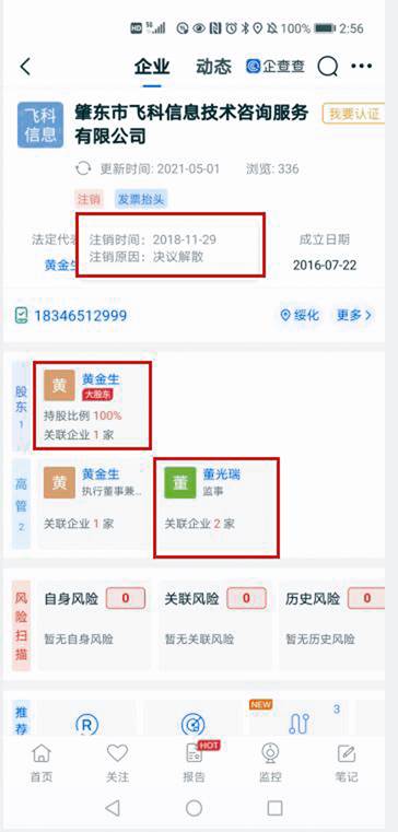 企查查顯示,飛科信息成立于2016年7月22日,這意味著飛科信息成立次年,便成為電旗股份采購比例超過50%的第一大供應商。讓人不解的是,擁有如此大好局面的飛科信息,竟然在2018年11月29日又決議解散注銷了(見圖二)。