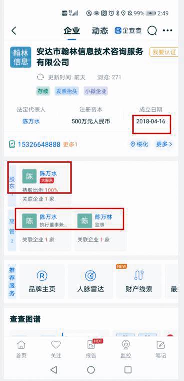 而翰林信息持股100%的股東為陳萬水,其任執行董事兼總經理,同時還擔任監事,企查查未顯示陳萬水與董靜杰之間的關系(見圖三)。