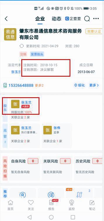 更為蹊蹺的是,2015年、2016年,電旗股份的第一大供應商易通信息,2017年未出現在前五大供應商的名單上,更于2018年10月15日決議解散注銷了(見圖七)。企查查信息顯示,易通信息持股100%的股東為張玉蘭,其擔任執行董事兼總經理,監事為張偉,而張玉蘭在2017年11月成立、2019年10月決議解散的億科信息曾擔任監事職務,企查查還顯示,張玉蘭和張偉都曾是億科信息的歷史股東。而億科信息和飛科信息背后站著的是同一實控人董靜杰,由此,易通信息是否和飛科信息之間存在關聯關系?如果存在關聯關系,電旗股份對上述兩家公司分開披露的原因是什么?這些問題同樣惹人關注。