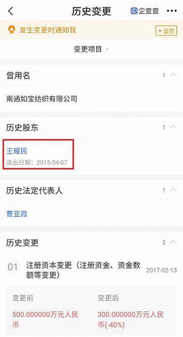 2015年4月7日,南通如寶曾發(fā)生投資人變更,股東王耀民退出,上述兩位股東持股至今(見圖一)。不過企查查顯示的工商登記信息中,股東王耀民退出前的持股比例并未顯示。