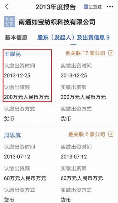 企查查顯示的南通如寶向當?shù)厥斜O(jiān)機構提交的企業(yè)年度報告中,透露了2013年的股東及出資信息,當年曹亞霞認繳和實繳出資額為240萬元、周思航認繳和實繳出資額為60萬元,而王耀民的認繳和實繳出資額為200萬元、出資時間為2013年12月25日(見圖二)。以此來看,股東王耀民在南通如寶成立當年就參股40%,并為第二大股東。