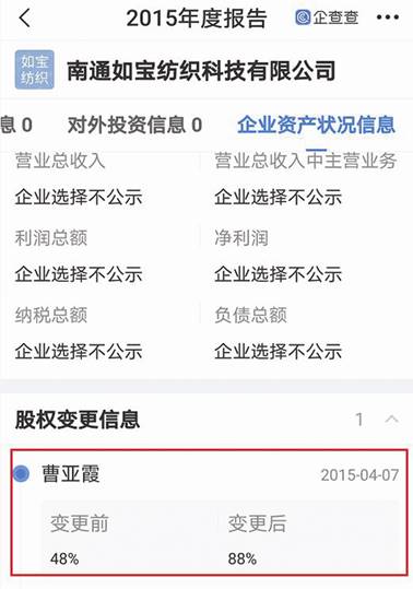 2015年的南通如寶企業(yè)年度報告則顯示,曹亞霞2015年4月7日的持股比例由48%增至88%,認繳和實繳出資額從240萬元增加到440萬元,周思航持股情況未變(見圖三)。以曹亞霞持股增加金額、時間來看,系股東王耀民將所持40%股權轉讓給了曹亞霞。