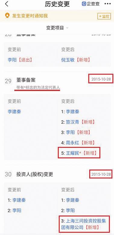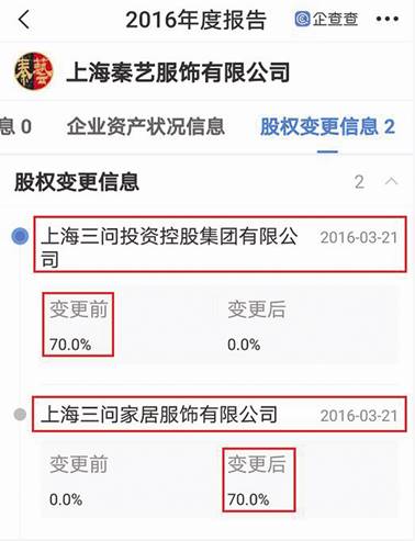 通過企查查查詢的工商登記信息、企業(yè)年度報告顯示,上海秦藝服飾有限公司即秦藝服飾在2015年10月28日出現(xiàn)投資人、注冊資本和法定代表人的重大事項變更,秦藝服飾注冊資本由1000萬元增至2500萬元、法定代表人由李建秦變更為王耀民(見圖五)。同時,三問家居控股股東三問投資新晉成為秦藝服飾的第一大股東,出資額為1750萬元,持股比例70%。