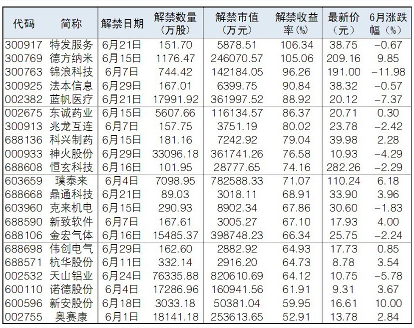 根據Wind數據統計顯示,6月共計有172家公司限售股迎來解禁。以昨日收盤價計算,42股解禁收益率超過50%。