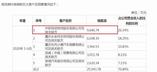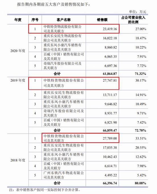 三羊馬的前五大重要客戶比較穩(wěn)定,例如最新招股書(shū)顯示,中鐵特貨(即中鐵特貨物流股份有限公司)及其關(guān)聯(lián)方在報(bào)告期內(nèi)始終位居公司第一大客戶,2018-2020年,公司分別向其銷售27789.00萬(wàn)元、27747.81萬(wàn)元、23419.16萬(wàn)元,向其銷售額占公司營(yíng)收比例在27%-34%區(qū)間(見(jiàn)圖一)。