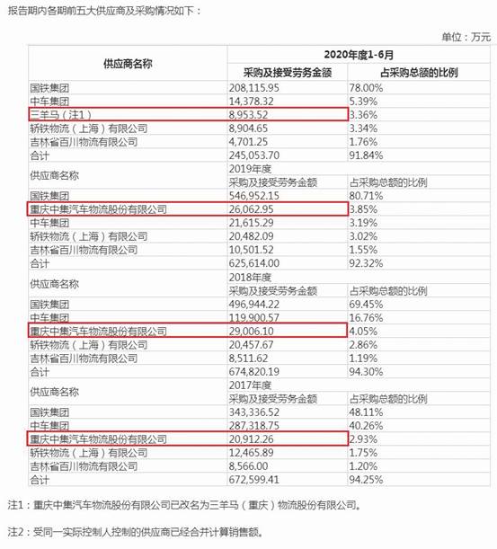 中鐵特貨同樣也在謀求主板IPO,其2020年底的最新招股書(shū)顯示,2017-2020年上半年,三羊馬(重慶中集汽車物流股份有限公司系公司前身)位列其前五大供應(yīng)商,中鐵特貨向公司采購(gòu)及接受勞務(wù)金額分別為20912.26萬(wàn)元、29006.10萬(wàn)元、26062.95萬(wàn)元、8953.52萬(wàn)元(見(jiàn)圖二)。