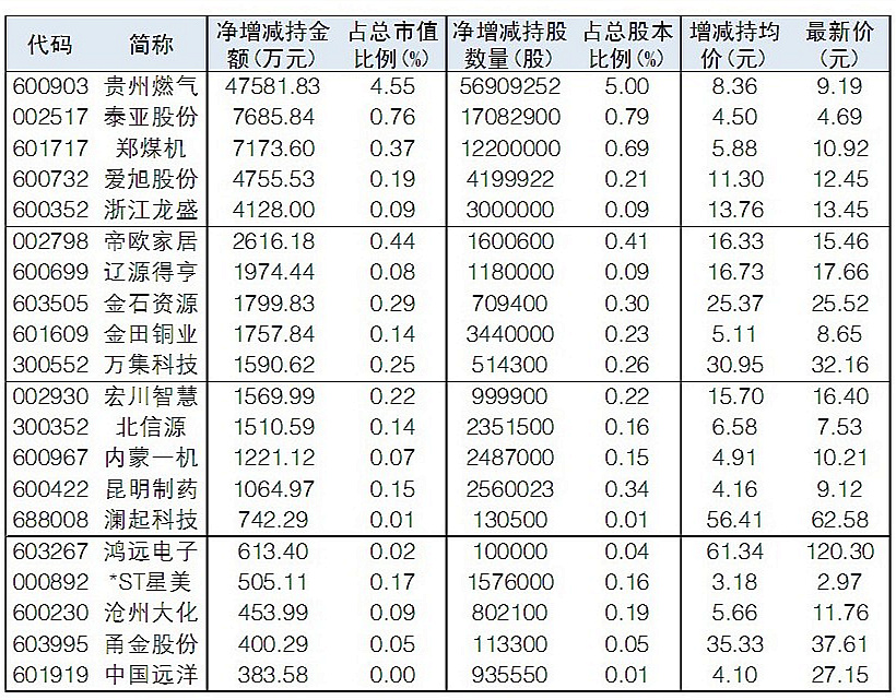 根據Wind統計,6月以來已有62股被自家管理層凈增持,其中有40股被管理層凈增持超50萬元。從凈增持市值占總市值比例來看,貴州燃氣、泰亞股份、帝歐家居、鄭煤機、金石資源、萬集科技、天安新材、宏川智慧等居前。